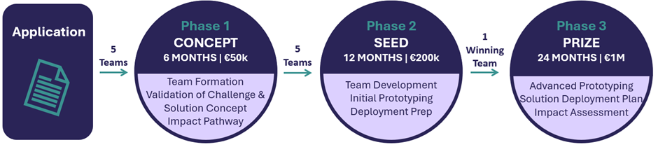 Funding will be available for collaborative research teams based in eligible research bodies in Ireland. Successful teams will be awarded up to €250,000 and will work through a series of phases to develop their idea. An overall prize award of €1 million will be available to the team that demonstrates the highest potential for transformative impact. The prize will enable the winning team to continue development and explore deployment of their solution.